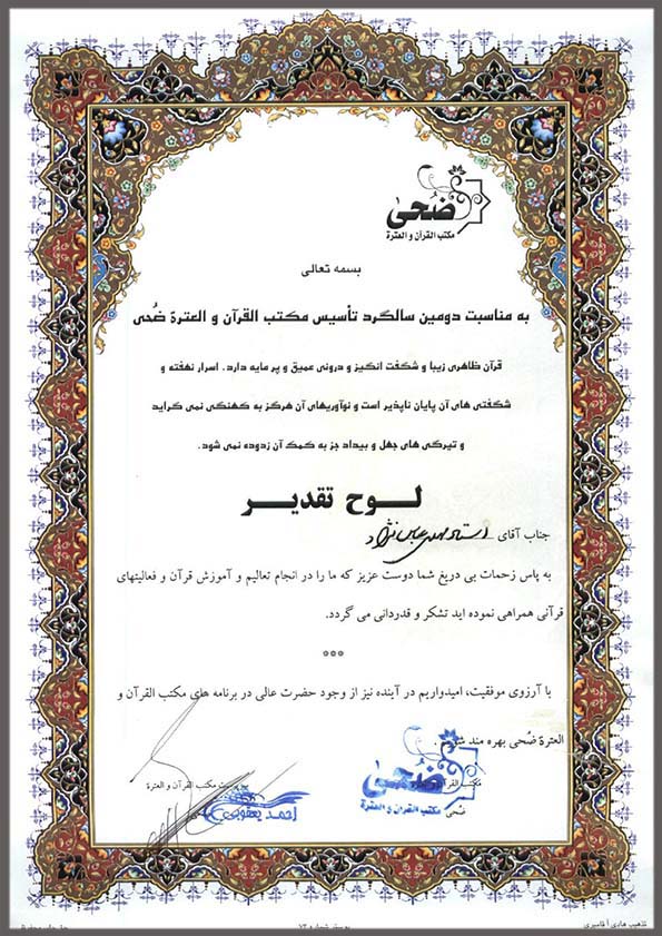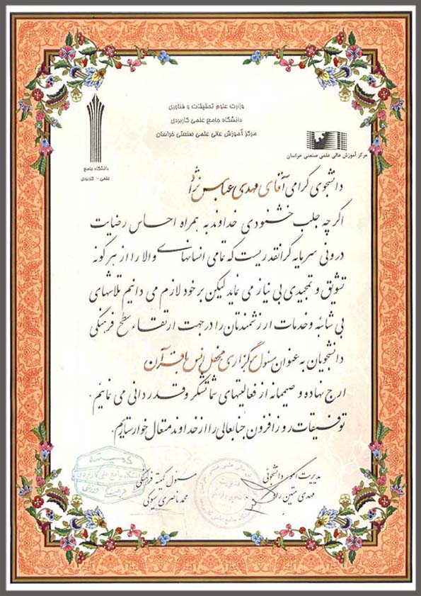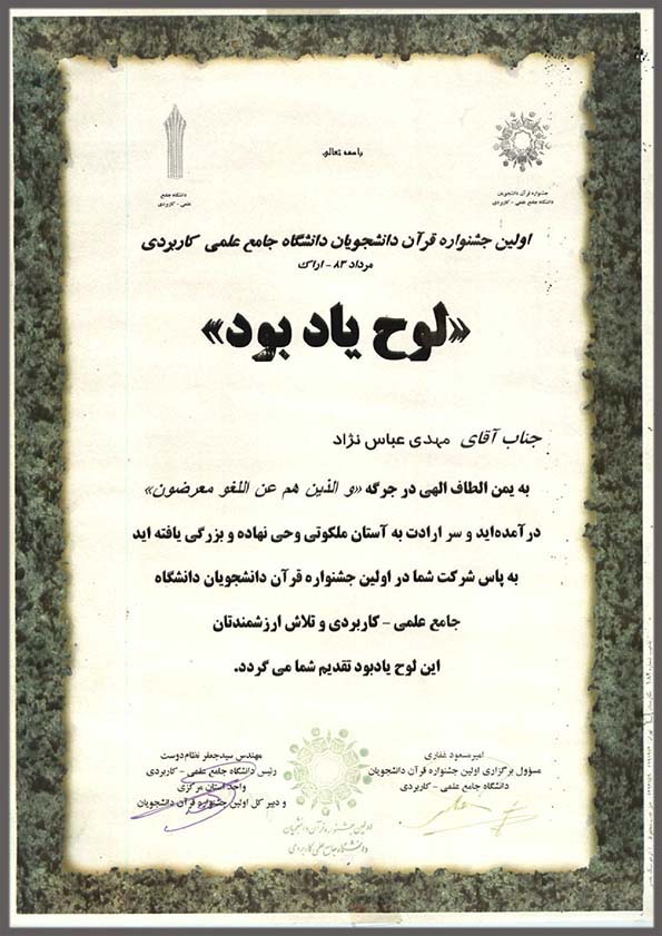 لوح یادبود اولین جشنواره قران دانشجویان دانشگاه جامع علمی کاربردی